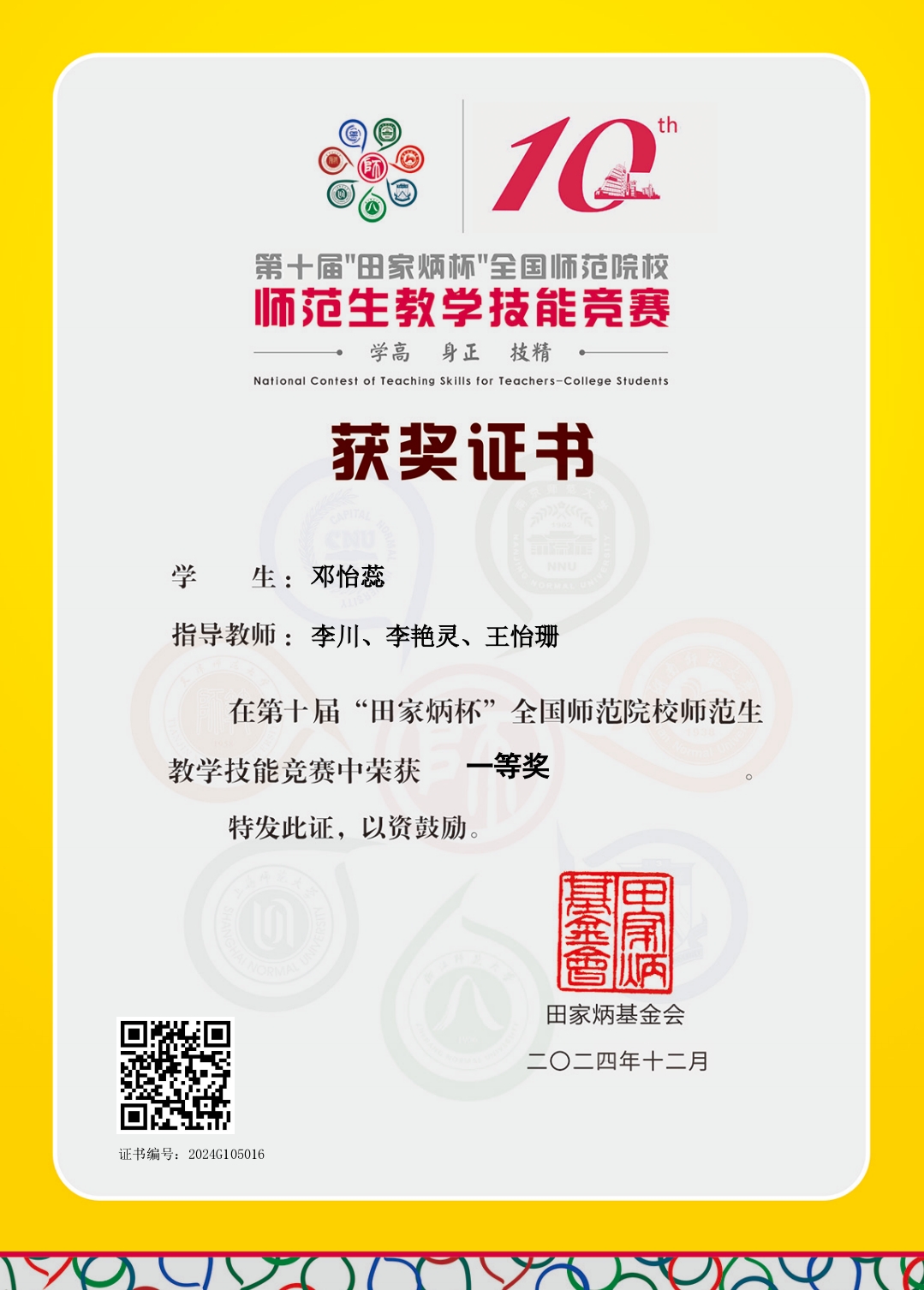 我院邓怡蕊同学在第十届“田家炳杯”全国师范院校师范生教学技能竞赛中荣获一等奖