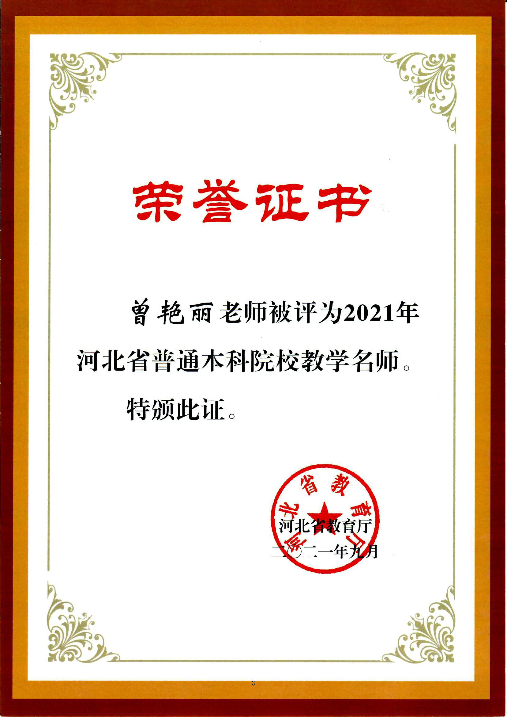 我院曾艳丽教授被评为2021年河北省普通本科院校教学名师