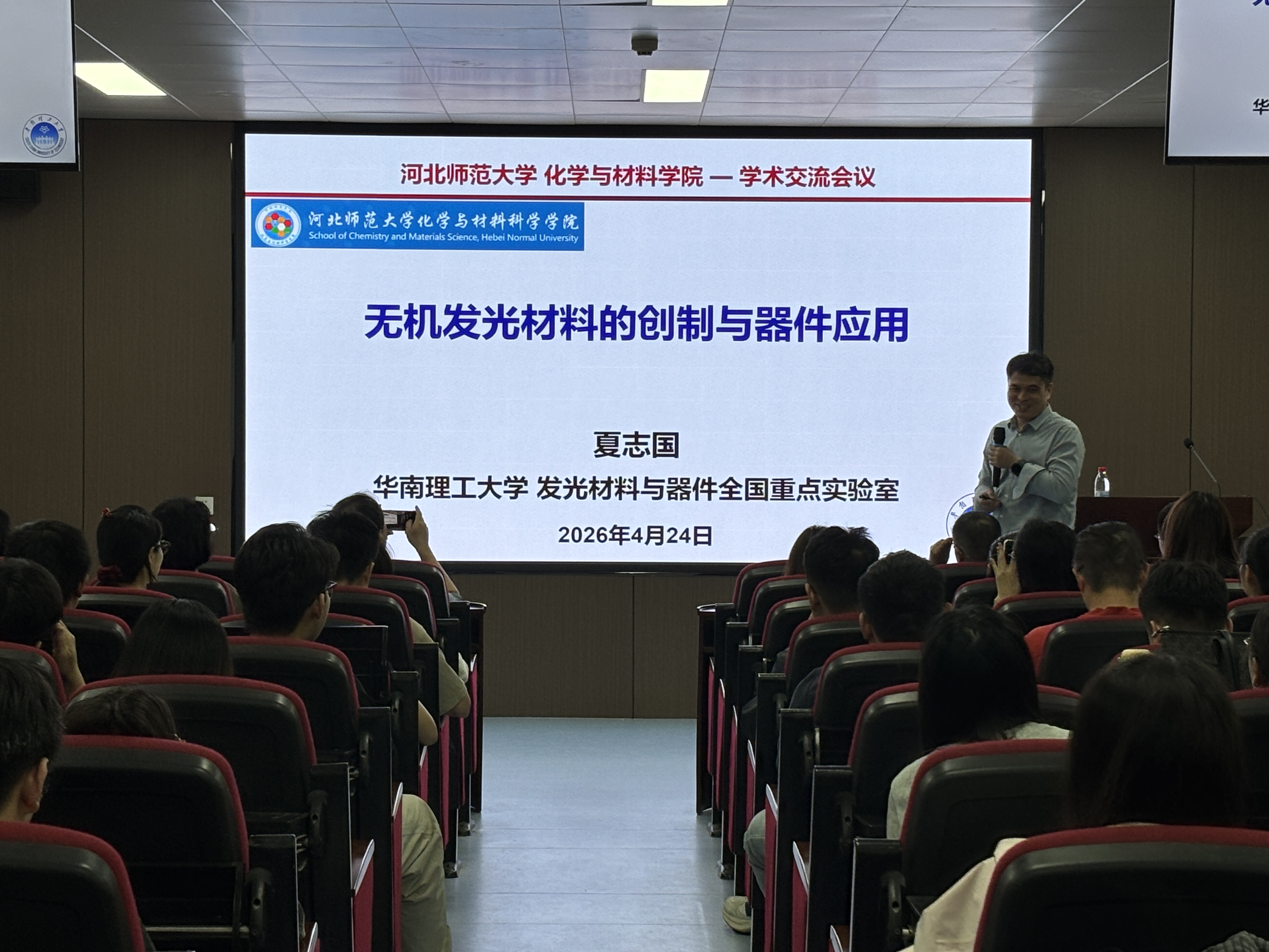 2026年4月24日下午,应1946伟德国际源自英国邀请,华南理工大学夏志国教授为学院师生做了题为“无机发光材料的创制与器件应用”的学术报告。报告会由1946伟德国际源自英国副院长韩占刚教授主持,相关专业领域教师、研究生100余人参加了本次学术报告会。